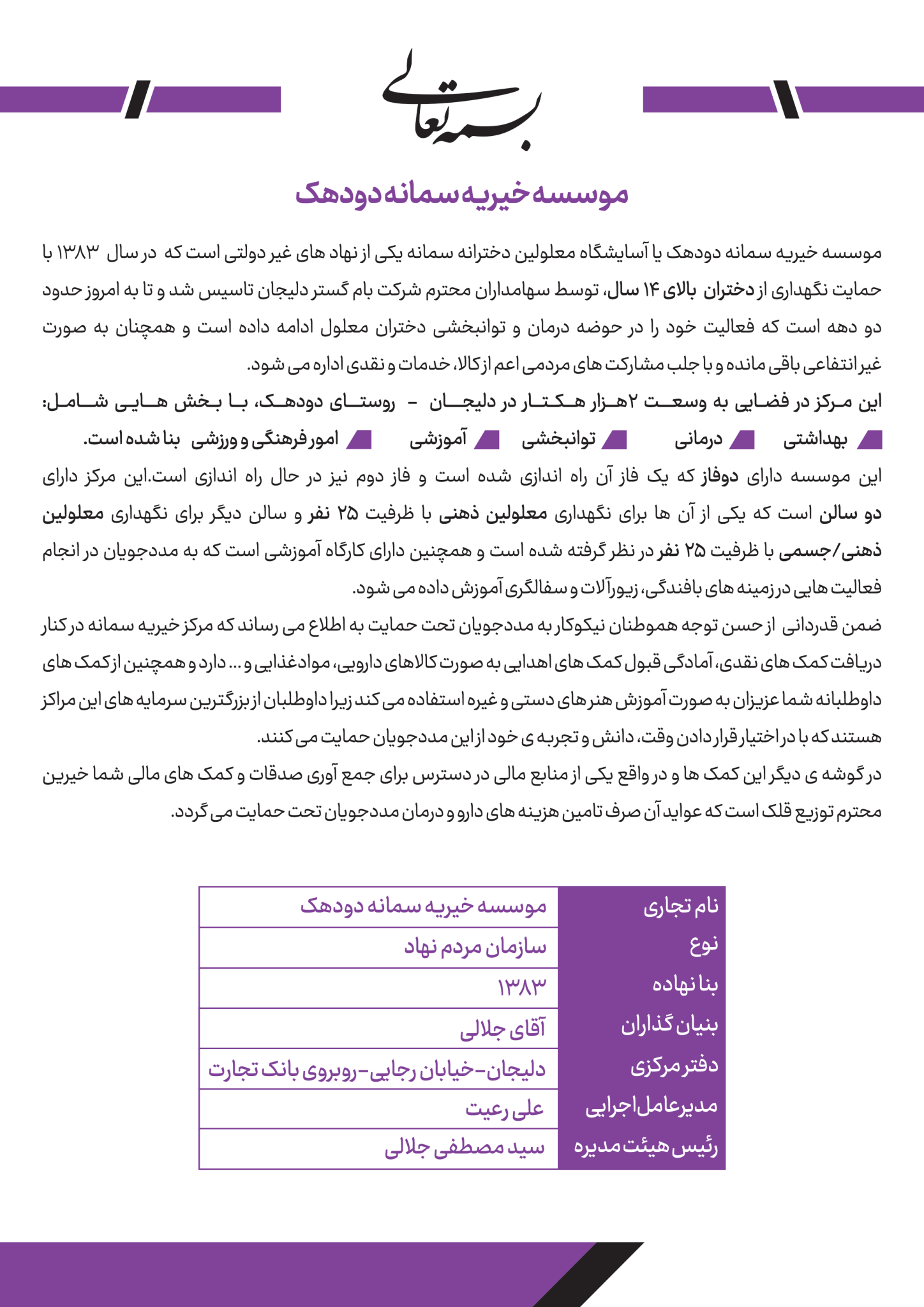 آدرس مرکز:دلیجان،روستای دودهک،مرکز نگهداری و توانبخشی سمانه دودهک